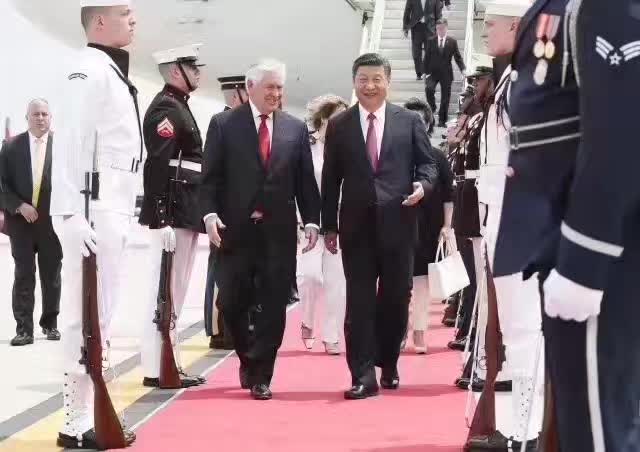 当地时间4月6日习近平乘专机抵达美国佛罗里达州,美国国务卿蒂勒森携夫人在机场欢迎习近平夫妇的到来,中国驻美大使崔天凯也到机场迎接。