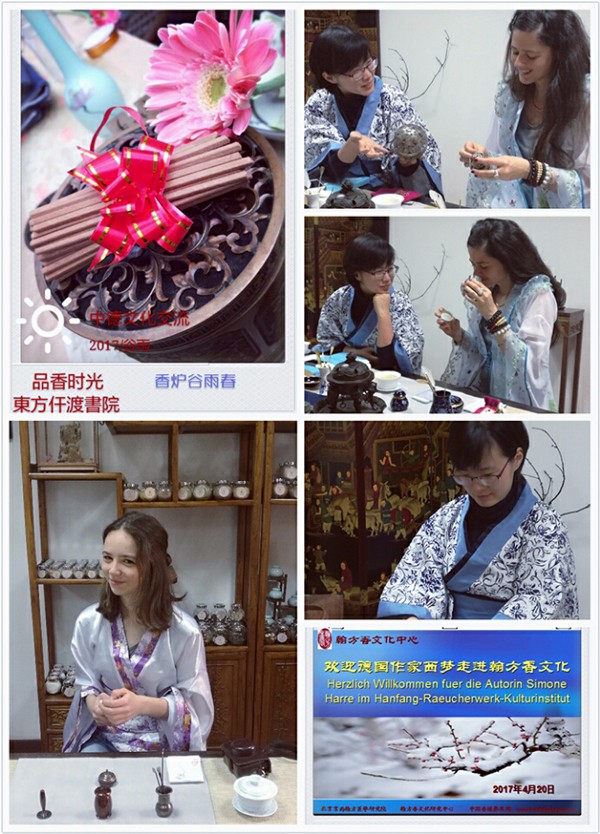 中国一带一路网消息:4月20日(谷雨日)上午,德国女作家西梦一行走进书院翰方香文化,深度了解古人用香历史。京西医学研究院院长师宝萍老师讲述了中华香文化历史和天然香与养生,谷雨时节品古香正合适,香气怡人。师院长把德国作家的视线带到远古的埃及和中国的红山文化,再现了香在数千年前人们生活中的身影。实际上汉代开始,香除了养生作用被重视外,香及香具已成为权利和身份的象征。皇帝、后宫和文人雅士用香,不同的香气代表不同和身份。古人的香是内涵丰厚的妙物,香是芳香又审美的,有“焚香伴月”的雅趣,也能养护身心,开启性灵。在用香和品香上更讲究心性的领悟。
