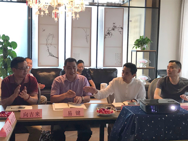 浙江杭州东方道时有限公司创始人谢陆鸣(右二)与中国一带一路网总裁易键、总策划向吉来交流。