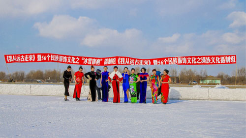 在松花江北岸古兰滩的冰雪外景地的拍摄对所有的演职人员都是一场冰雪的洗礼,特别是经过严格选拔出来的十位旗袍佳丽不畏严寒在零下二十多度的凌烈寒风中时而端庄优雅,时而妩媚动人的展示着旗袍服饰独特的风姿。