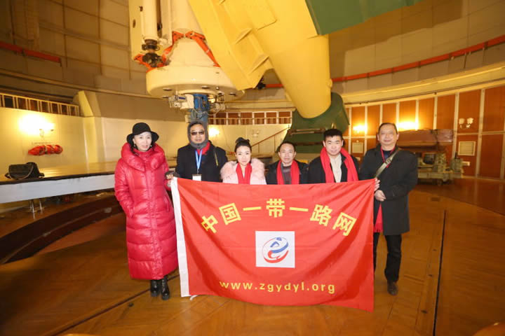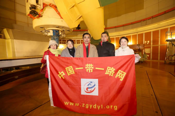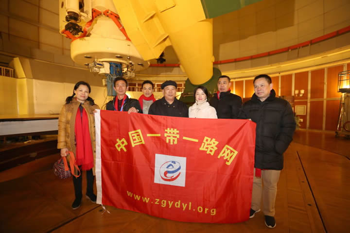 中国一带一路网总策划向吉来(左一)、中国一带一路网总编辑易键(右三)、中国一带一路恒道太极研究院院长郑耀成(右四)与中国一带一路网办事处高管在兴隆观测站合影。